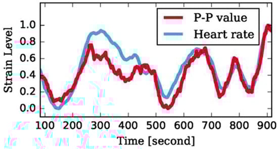 Two types of sample extraction methods with rowing and padding, and five kinds of feature amounts of P-P value, maximum value, minimum value, average value, and time width were combined to create 10 pattern data sets. As a result of comparing correlation coefficients between these data sets and heart rate data, the maximum value was 0.78 (P < 0.001) of the padding and P-P values. Figure 4 shows the smoothed row vibration P-P value and heart rate of the participant having the highest correlation value of 0.92. The two data were normalized with minimum value 0, maximum value 1. It was confirmed that the P-P value of the acceleration data of the manual wheelchair was highly correlated with the burden of padding, that is, the road surface barrier.