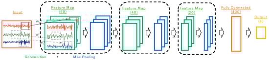 The structure of the DCNN used in this paper is shown in Figure 5. This network was composed of six layers of input layer, three convolution layers, a fully connected layer, and an output layer. By using the hierarchical structured network to learn functions from input to output, it was possible to proceed simultaneous learning of the feature extractor h and the classifier f that are effective for data classification. In the convolution processing part, following the representative research [11], two processes of convolution and max pooling were used. Here, w in the figure was a weight to be convoluted with respect to the input data, which was a parameter learned to successfully map the input to the output. Feature Map (N) in the figure means that different kinds of different weights were learned to obtain N types of different outputs, respectively. As another setting, Adam was used for learning of the neural network, and the learning rate was set to 0.0001. Rectified linear units were used for the activation function, except for the softmax function, which was used in the output layer.