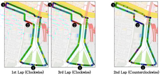 Figure 6 shows the feature amount clustering result example when E1, having the highest classification accuracy of the DCNN, was used as test data. When visualizing on the map, the position information corrected based on the moving image was used. As shown in Figure 6, each user was traveling three times on the route, and on the second lap, the route was traveled in the opposite direction between the first and third laps.