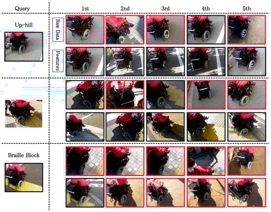 Figure 7 shows a similar road surface search result with three queries; uphill slope, curbstone, and a place crossing a tactile block. For the color of the frame of the image, black was used when having the same road feature, as Query was readable from the image, and red was used if it cannot be read that it had the same road feature. In an uphill search example, in the case of the raw data of the acceleration, only the fourth rank among the top five corresponds to uphill slope, and in the case of using the feature quantity of the DCNN, all the top five corresponded to uphill slope. In a curbstone retrieval example, when using the raw data of acceleration, curbstone corresponds to the first and third rank, and in the case of using the feature quantity of the DCNN, all the top five corresponded to curbstones. In a crossing tactile block example, in the case of the raw data of the acceleration, it was judged to be similar to the data of the point where the wheelchair was stopped. In the case of using the feature quantity of the DCNN, only the first place among the top five cases corresponded to the place where the tactile block was crossed. The misjudged second to fourth were roads with continuous unevenness composed of small tiles. It can also be said that these were the results that the similarity with the feature of Query, when traveling on the tactile block, was correctly captured.