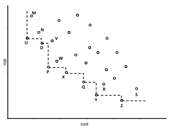 On the other hand, the skyline query is one of the popular methods for selecting representative objects from a large dataset. It retrieves a set of representative objects, each of which is not dominated by any other object within the database. For example, let us consider the issue of financial investment: an investor usually wants to purchase the stock that can minimize the commission costs and predicted risks. As a result, the target can be formalized as finding the skyline stock with minimal cost and minimal risk. Figure 1 shows a sample plot diagram of stock records along with their costs and risks. If we want to provide a suitable suggestion list for our clients using skyline query, the result will be . From Figure 1, it is obvious that no other object, within the given sample dataset, can dominate those seven objects. Therefore, they are in the skyline result. The skyline query attracts consistent attention in database research, due to its applications in decision making as well as analytics.