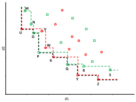 Additivity of Skyline Computation [36]: Given a dataset and p datasets such that , the following equation holds: . In Figure 2, if we consider that the red bubbles represent the objects of and green squares represents the objects of . Then the skyline objects set of and can be given by and . However, the common skyline objects set can be given by , where and .