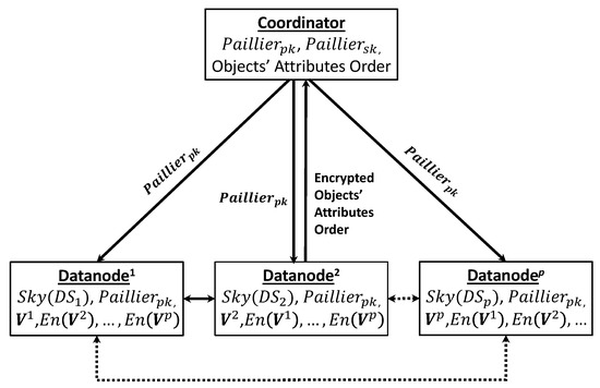 Figure 3 describes the simplified block-diagram of our proposed privacy-preserving skyline computation model. Where we use one coordinator and p is the number of participating parties. Each represents the substitute vector generated by , and represents the encrypted substitute vector of , where each element of is encrypted using the Paillier public key.