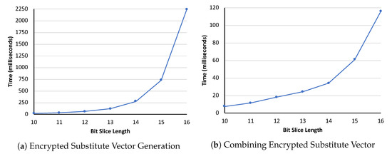 We also studied the process execution time for joining the encrypted substitute vectors using homomorphic addition property according to Section 5.5. In this regard, we examined the runtime of combining three substitute vectors generated by three participating parties for varied bit-slice length. Our experimental result is illustrated in Figure 4b.