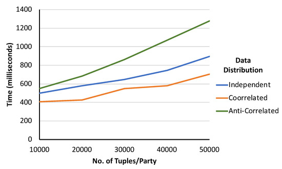 In this section, we evaluate the performance and effectiveness of our proposed framework. We used four identical computers connected with Cisco Catalyst 2960-X Series Gigabit Switch for the experimental setup. Out of the four computers one was considered to be the coordinator and other three computers as individual parties containing private datasets. Each of the computers has an Intel® Core™ i5-6500 3.20 GHz CPU and 8 GB memory. We used the 64-bit Ubuntu 16.04 operating system for our experiment. We compiled the source codes of the program under Java V8 and executed the program under Java™ 1.8.0 Runtime Environment. We generated synthetic datasets for evaluating the performance of our proposed framework. Each attribute value of the synthetic datasets was randomly picked from 32-bit unsigned integer. For the proposed study, we put our focus on the performance of generating secure object order targeting skyline computation from the privacy-preserved multi-party databases without unveiling the original attributes’ value of the objects to anyone. For evaluating the efficiency of our model, we considered that all participating parties begin to generate the encrypted substitute vectors and compute there local skyline objects set simultaneously after obtaining the Pallier public key, Paillierpk from the coordinator.
