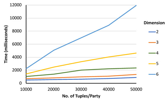 On the other hand, our proposed framework is comparatively less dependent on the number of participating parties. The coordinator generates the homomorphic encryption key-pair only for one time for the whole process. And our framework does not employ secure comparison protocol like [6]. Moreover, it just requires six rounds of data exchange for the entire computation process: at the beginning between the coordinator and the participating parties for sharing the public encryption key. After that, three rounds communication requires between the participating parties for fixing the bit-slice length, for sharing the encrypted substitute vector and merging the individual parties’ local skyline objects’ encrypted order on each attribute. Then, another round of communication required for sending the merged set of local skyline objects’ encrypted order to the coordinator. The final round of data communication needed between the coordinator and the participating parties, for sharing the encrypted s of the globally qualified skyline objects. Although it requires to transmit a large amount of data during the sharing of each party’s encrypted substitute vector, it is negligible compared to five rounds of information exchange for each dominance relationship comparison of two parties’ objects.