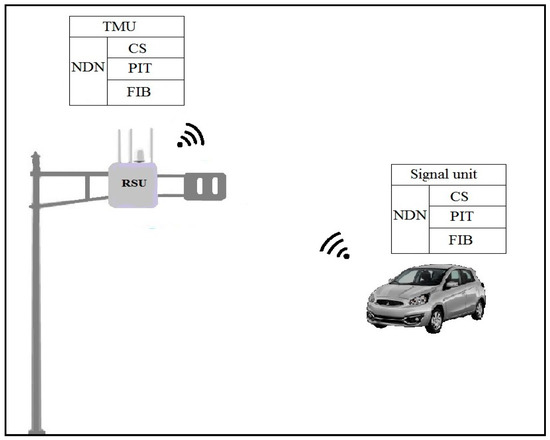Our system architecture includes two types of nodes, namely, RSU (which represents the provider) and vehicle (which represents the consumer). RSU provides the data for passing allowance (data packet) while vehicles receive (or consume) the allowance passing the intersection (interest packet). However, RSU maintains two components: NDN node and traffic management unit (TMU). TMU is responsible for managing the vehicles passing the intersection. In RSU, CS stores all satisfied interests for already passed vehicles for a few minutes while PIT stores the interest that has already arrived but has not passed the intersection yet.