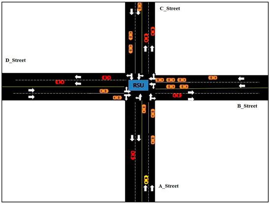 Suppose that RSU in Figure 2 receives a number of packet interests for vehicles during a specific period of time, as shown in Table 1. According to Equation (1), the weights of A, B, C, and D streets are 560, 330, 495, and 605 s, respectively. In this example, the required times for each street vehicles are 52.5, 42.5, 47.5, and 55 s. In this case, RSU sends “pass” data packets to all vehicles in D Street with the assigned time for 55 s. Simultaneously, RSU sends “wait” data packets to all other vehicles. RSU then sends “pass” data packets to all vehicles in A Street for 52.5 s and “wait” data packets to all other vehicles.