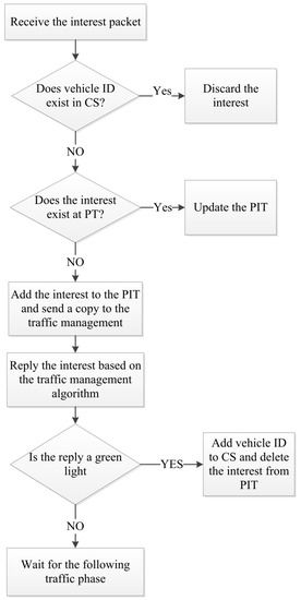 When an interest packet arrives at RSU, the packet name is checked in the CS. If the interest already exists, then this interest will be discarded directly. Otherwise, RSU lookups the PIT to check whether this interest pack et already exists. If the packet exists, then the interest is updated with the new information. Otherwise, the interest is checked in the PIT. If the interest exists, then its time is updated and becomes priority. If the interest is unavailable, then it is added to the PIT. After collecting the interests, RSU sends the arrived interests to the traffic management unit (TMU). The traffic decision of the vehicle is made according to the traffic management algorithm in the RSU. The RSU then disseminates the corresponding data packets through the networks to each vehicle at the range of RSU. After forwarding the data packet, the interest is removed from the PIT. However, the interest packet is kept in CS for a while and forwarded to the other neighboring RSUs. This step provides the other RSUs with the pre-knowledge regarding the probable number of vehicles that could arrive at the intersection. Figure 3 demonstrates the process of receiving interest packets and sending data packets in RSU.