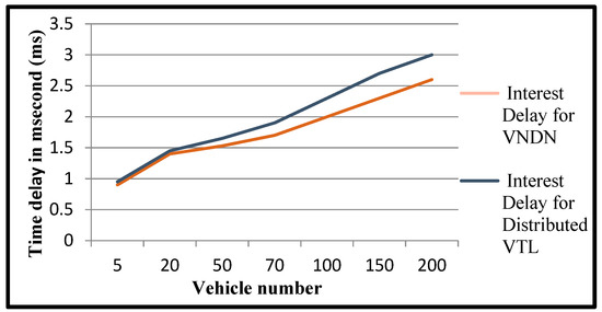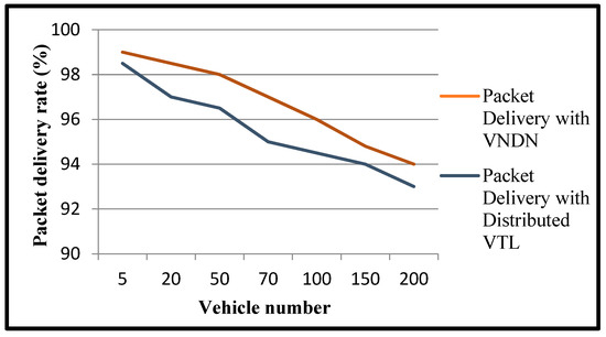 The original VNDN design in low-density and high-speed vehicles demonstrates low performance in packet delivery rate due to the increasing number of vehicles [2]. By contrast, our design demonstrates good performance under low vehicle density due to the small communication area required for packet exchange between the vehicle and RSU. Another factor that enhances the communication performance under low vehicle density is the sufficient reply time of the interest when the vehicle enters the RSU communication range. Furthermore, the high-speed scenario rarely occurs due to the low speed policy of vehicles in urban areas. Figure 4 shows the time delay when various numbers of vehicles move during the simulation process for our design and the distributed VTL. The delay is the duration between the sending of the interest packet by the vehicle and the receipt of the data packet from the RSU. The message exchange and name lookup processes will increase with the number of vehicles. Therefore, the increasing time delay is a consequence of the increasing number of vehicles. Packet delivery rate is the number of packets exchanged between vehicles and the RSU to all interest packets issued by the vehicles. Notably, the packet delivery rate degrades when the vehicle number is larger than the threshold or vehicles move out of the RSU range. Therefore, the increasing number of vehicles leads to an increase in packet delivery rate within the threshold as shown in Figure 5. With use of our algorithm, the influence from the opposite direction vehicles is avoided, and the packet is delivered perfectly to the RSU. In addition, the implemented geo-based strategy [6] continues to forward the packets until they are delivered to the requester or another node takes over. Therefore, this strategy enhances the packet delivery rate.