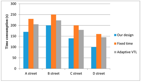 Second, we evaluate the application performance of our design and the adaptive VTL. By implementing our traffic management algorithm, the total wasted time is reduced under high and low traffic conditions. Vehicles in our design respectively consume 15% and 20% of the total stopping time in case of the fixed time lights and adaptive VTL for low traffic condition. In total, only 8 vehicles consume the time that 51 vehicles in fixed light traffic could consume and that consumed by 41 vehicles in adaptive VTL when passing the intersection for all streets as depicted in Figure 6. In case of high traffic condition, the total wasted time of vehicles represents 72% and 81% of the time with use of fixed time programming and adaptive VTL, respectively. This finding means that 610 vehicles consume time in fixed light traffic similar to that in 840 vehicles when passing the intersection, as depicted in Figure 7, for all streets. Notably, our design presents a significant improvement in reducing the waiting time for low traffic condition more than that in high traffic condition. This finding is due to the need for the RSU to distribute the time between all directions under high traffic condition unlike that in low traffic condition, where some directions could be empty.