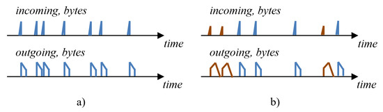 Figure 2a shows an example of the intensity of incoming and outgoing traffic when the web server processes requests of the same type. Figure 2b shows an example of the intensity of incoming and outgoing traffic when the web server processes requests of two different types. Requests of different types have a different form of intensity and are indicated by different colors for clarity.