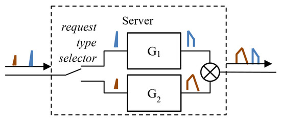One can see an analogy between the example shown of processing network requests and the input-output of the transfer function of the dynamic plant used in the theory of automatic control. The traffic intensity measured at discrete instants of time, according to this analogy, can be considered as a signal, and the web server acts as a dynamic plant that converts the signal. Developing this analogy, we see that the web server’s processing of requests of different types can be represented as a scheme, which is shown in Figure 3. In this case, the web server performs a query type determination and then processes each request using its own block: or .