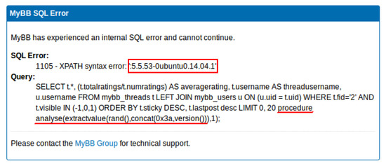 We are interested in the version of MyBB 1.8.6, in which the SQL injection [37] vulnerability was discovered in 2016. The vulnerability allows entering in a numerical field a fragment of SQL code that will be executed by the DBMS because of incomplete control over the input values. Thus, we are dealing with a usual SQL injection vulnerability. A small peculiarity is that when one fills the web form with code injection and sends it to the web server, everything in the reply looks normal. However, when performing an operation for accessing the forum with an incorrect identifier, instead of the usual request error message, a text appears in the web browser window as a result of executing the injected code, as well as an error message about failed MySQL operation. The result of the SQL injection attack is shown in Figure 4.