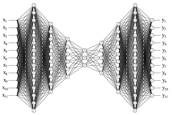 The structure of the autoencoder for the classification of XCFs was chosen based on the width of the correlation window and expert ideas about the possibilities of the autoencoder. The experiments used an autoencoder with 11 neurons in the input layer, which is equal to the width of the discrete cross-correlation function, and successively located fully-connected neuron layers of 15, 10, 6, 3, 5, 10, and 15 neurons and 11 neurons in the output layer. The structure of the autoencoder for the one-class classification is presented in Figure 5.