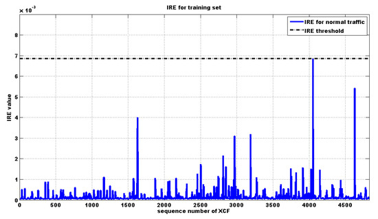 After training the autoencoder for each vector of the XCF of the training set, an IRE value was obtained that characterizes the quality of input XCF recognition. The graph of IRE values for the normal operations with MyBB is shown in Figure 6. The maximum value of IRE was equal to 0.0068.