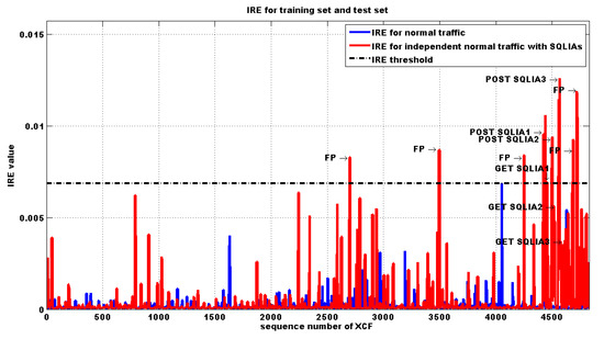 To test the trained autoencoder for the detection of anomalies, a test set with several SQL injection attacks and with normal operations should be prepared. We made three SQL injection attacks among normal operations with MyBB. The exploited SQL injection vulnerability of MyBB included two phases: query with SQL injection (POST SQLIAs) and further call of the embedded code (GET SQLIAs). According to the graphs of the intensity of the measured incoming and outgoing traffic, XCFs were calculated. Then, the vectors of the consequent intensities were fed to the input of the autoencoder to produce output vectors. The calculated IRE graph is shown in Figure 7 together with the graph of IRE for training data and the threshold line.