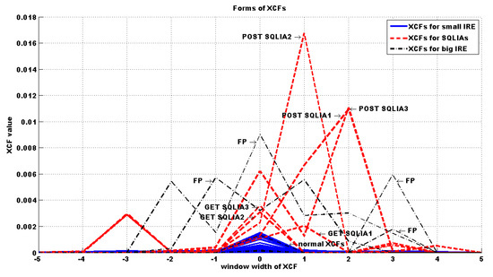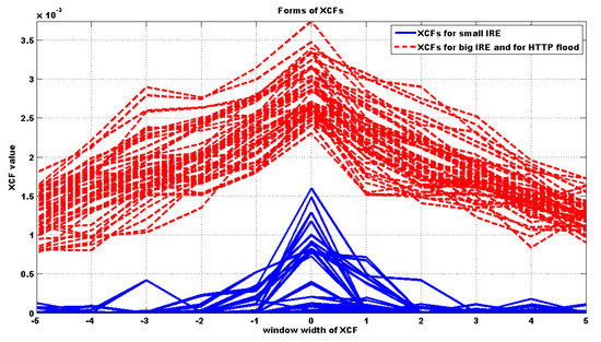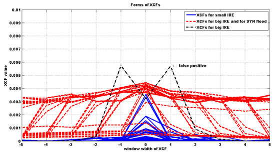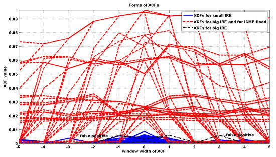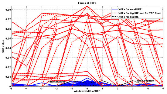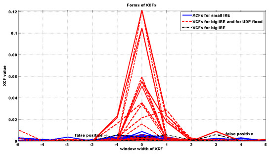 We can see no false positive detections before the start of the attack. The delay of the attack detection was equal to 8.3 s. The form and the amplitude of the anomalous XCFs greatly differed from normal traffic ones (Figure 23). Such visual differences usually lead to easy classification.