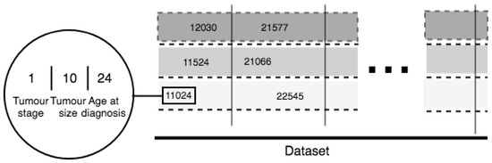 For the purposes of our study we developed a novel and universal predictive parameter—Tumor-Integrated Clinical Feature (TICF). This feature is built by numerically concatenating the tumor stage, tumor size, and age at diagnosis (Figure 3) in this exact order. The order of concatenation of these clinical parameters is important because of the ranking of clinical information about tumor development and its relevance to the patient survival rate. Specifically, a patient with a tumor in stage four, will have a shorter survival time compared to patients with a tumor in stage two. The next feature—tumor size—is added second because with an increase of the tumor size the survival rate of the patient is reduced. The tumor size is the second feature also because it is less important for the survival time than the stage of the tumor. The third used feature is the age at the time of diagnosis, where older patients have a lower survival rate. If the order of concatenation of these TICF-composing features would differ, patients with distant survival-related features would be incorrectly grouped. In this manner, we provide a normalized distance between patients, essential in our subsequent ML approaches to survival time prediction.