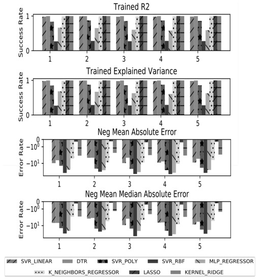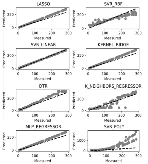 For our study we used hardware resources with the following specification: 2 x Intel(R) Xeon(R) CPU E5-2620 0 @ 2.00GHz, RAM 32GB DDR3 1333 MHz. The parameter settings of each applied model were tested in various numerical values. The best outcomes in accuracy and running time (Table 1 and Table 2), given in the paper, were obtained by using parameters settings for linear models: C = 1 and Gamma = auto, which is equal to 1/n_features. For the DTR model the initial setting max_depth is chosen to be equal to 4, which again is a default parameter setting from the used scikit-learn Python library [12]. For Kernel_Ridge we also used the default parameter setting, alpha = 1, kernel = “linear”, degree = 3. MLP_Regressor has hidden layer size = 500. KNR parameter settings are default with n_neighbor = 5. Lasso is also with default parameters with alpha = 1.