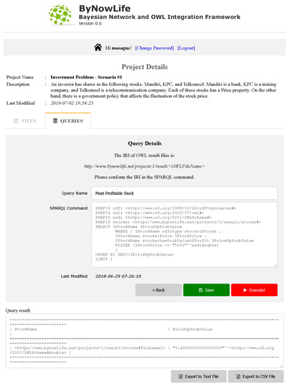 ByNowLife was developed not only as a theoretical foundation in combining logical with probabilistic knowledge bases but also a technical implementation that can be tested with various test cases. Online technical implementation of this framework can be found on the ByNowLife website [21]. The system requires input in the form of logical knowledge-based files (.owl) and probabilistic knowledge-based files (.xdsl). After both files are uploaded and the knowledge bases have been integrated, the user can query to communicate with the system. Users can also download the resulting .owl and .xdsl files from the system if needed. Figure 2 shows a screenshot of the website’s content.