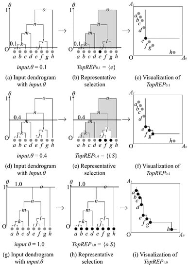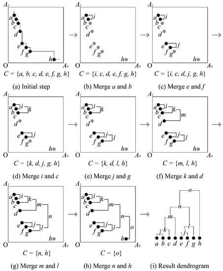 Figure 4 illustrates the example of the clustering step in two-dimensional space with 8 skyline points. Here, the input skyline points are labeled from a–h along the axis A0. First, the algorithm receives the set of skyline points S in Figure 4a and initializes the list of clusters C = {a, b, c, d, e, f, g, h}. As shown in Figure 4b, the closest clusters are a and b, and thus, they are merged, where cluster i is formed. Further, the cluster a and b are removed from C, and i is inserted into the C = {i, c, d, e, f, g, h}. In Figure 4c–h, the algorithm repeats the merging process until C has a single cluster. Finally, in Figure 4i, it returns the resulting list of clusters that contain the root of the dendrogram.