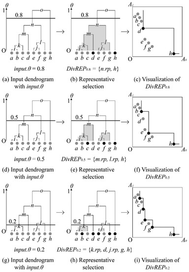 In Algorithm 3, we show a procedure for selecting the diverse representative skyline points. It receives the dendrogram DE and input.θ as input and outputs the list of diverse representative skyline points, DivREP. On line 1, the algorithm initializes the empty list of diverse representative skyline points DivREP, and on line 2, it initializes the currentCluster as the root of the dendrogram DE. On line 3–13, the algorithm traverses through the dendrogram DE recursively until it finds the diverse representative skyline points, which satisfy the user given threshold. Finally, on line 14, the algorithm returns the list of diverse representative skyline points DivREP.