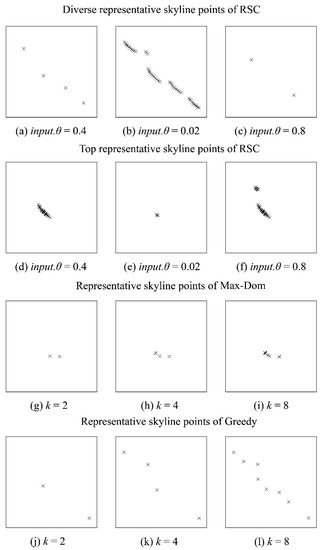 Figure 9 shows the diverse and top representative skyline points, which are selected by our proposed method from the Anisotropic dataset with varied input.θ value and representative skyline points of the Max-Dom and Greedy methods with varied k value. Specifically, Figure 9a–c shows the diverse representative skyline points, which are selected by our proposed RSC method. Figure 9d–f shows the top representative skyline points, which are selected by our proposed RSC method. Figure 9g–i shows the representative skyline points, which are selected by the Max-Dom method. Finally, Figure 9i–l illustrates the representative skyline points of the Greedy method, which utilizes the distance measurement to find the representative skyline points. If we observe Figure 8b, we can divide the skyline points into four major groups. It is important to note that the input.θ value we used for Figure 9a,d is the input.θ value calculated by the LMethod, which is described in Section 3.4.3. As shown in Figure 9a, by using the input.θ = 0.4, we captured the full contour of the skyline points, which is shown in Figure 8b. Figure 9b shows the diverse representative skyline points of the Anisotropic dataset when the input.θ = 0.2.