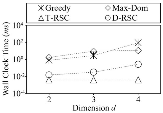 T-RSC and D-RSC use default input.θ = 0.1 while Greedy, Max-Dom uses k = 6 as we mentioned in Table 3. The horizontal axis of Figure 10 indicates the number of dimensions d and the vertical axis indicates the wall clock time in milliseconds in the log10 scale. The re-computation of T-RSC is linear due to the singleton to root traversal. Moreover, it is clear to observe that our proposed method outperforms the state-of-the-art representative skyline points selection methods in re-computation time by approximately 41–52 times.