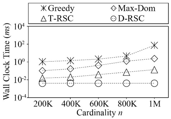 In this experiment, we compare the re-computation time of related work with our top representative skyline selection and diverse representative skyline selection algorithms on the anti-correlated synthetic dataset. The dataset has two dimensions and contains various cardinalities. For the experiment, we use the wall clock time to measure the re-computation time of the methods. Figure 11 shows the comparison of the re-computation time of four different algorithms. T-RSC and D-RSC use default input.θ = 0.1 and Greedy, Max-Dom uses k = 6 as we mentioned in Table 3. The horizontal axis of Figure 11 indicates the cardinality of dataset |P| and the vertical axis indicates the wall clock time in milliseconds in the log10 scale. The re-computation of T-RSC is linear due to the singleton to root traversal. Moreover, it is clear to see that our proposed method outperforms the state-of-the-art representative skyline points selection methods in re-computation time by approximately 9–17 times.