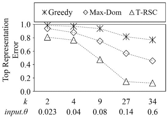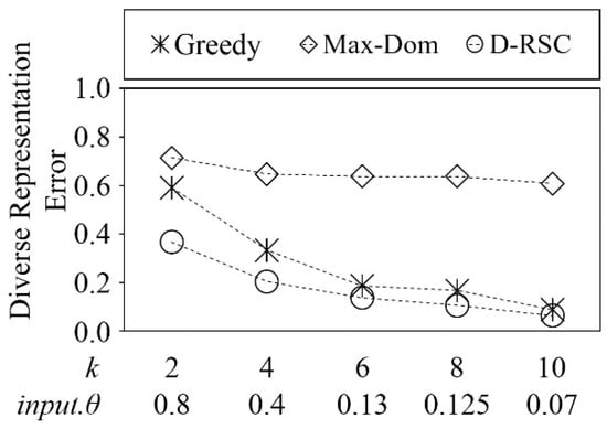 Figure 13 shows the comparison of diverse representation error between Max-Dom, Greedy, and D-RSC, which stands for diverse representative selection algorithm. The horizontal axis of Figure 13 indicates the input.θ and k the vertical axis indicates the diverse representation error.