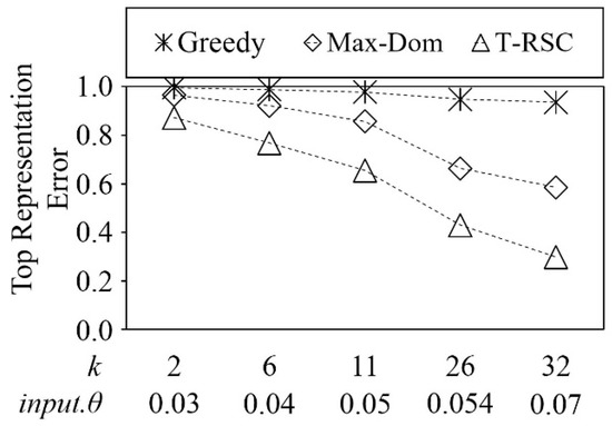 The top representative points should be the data points, which are closest to the centroid of the overall skyline points yet, they must be close to each other. Figure 14 shows the comparison of top representation error between Max-Dom, Greedy, and T-RSC. The horizontal axis of Figure 14 indicates the input.θ and k the vertical axis indicates the diverse representation error.