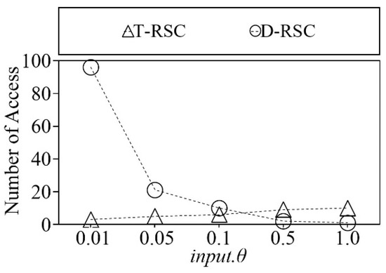 Figure 17 shows the comparison of the number of clusters accesses of two different selection algorithms. The horizontal axis of Figure 17 indicates the input.θ and the vertical axis indicates the number of cluster accesses. As shown in Figure 17, T-RSC has a smaller number of cluster accesses when the input.θ < 0.5. It is because of the same reason as the previous experiment. Specifically, the two algorithms use a different traversal procedure. As we mentioned earlier, to select the diverse representative skyline points, the proposed method uses root to singleton cluster traversal. On the other hand, to select the top representative skyline points, the proposed method uses a singleton cluster to root traversal.