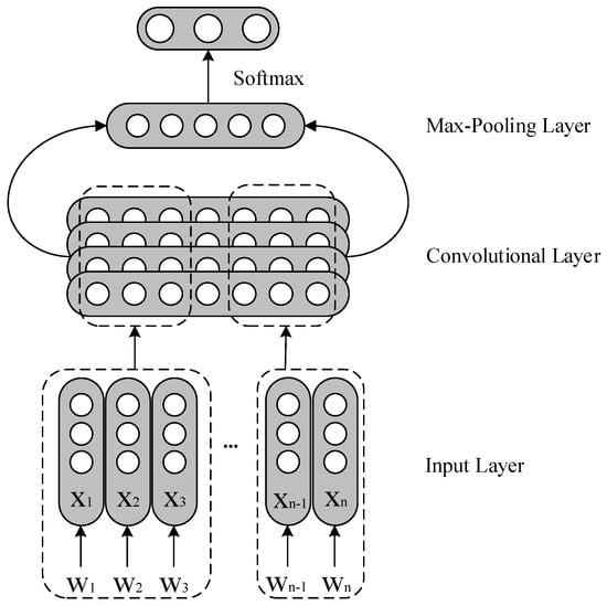 Convolutional Neural Network (CNN) model [] has subsequently achieved excellent results in many NLP tasks. The architecture of the CNN model is shown in Figure 2. In the training process, a convolution operation uses a filter which has a window of h words to produce a new feature. For example, a feature generated from a window h of words sequence is defined as follows: