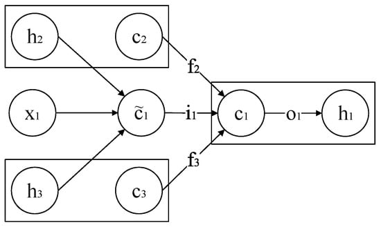 The difference between the standard LSTM units and Tree-LSTM units is that gating vectors and memory cell updates are dependent on the states of possibly many child units. Unlike the standard LSTM, in which each node of LSTM only has one son, Tree-LSTM has a forget gate for each child node, which selectively combines the semantic information of each child node. For example, if there are three words in a sentence, and are child nodes of in the syntactic tree, the structure of LSTM units should be constructed as Figure 4, while the Tree-LSTM units should be constructed as Figure 5.