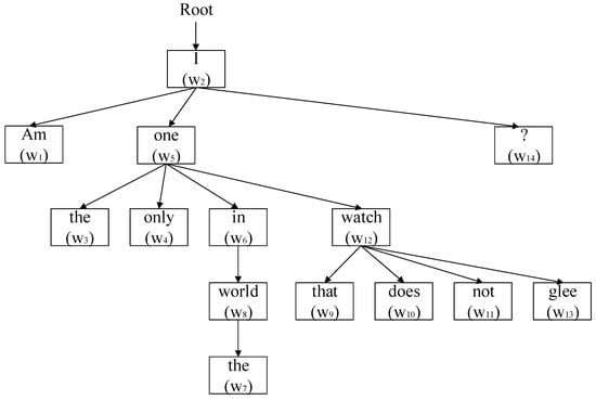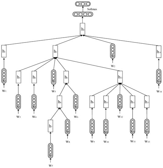 The Tree-LSTM model in Figure 8 can be constructed based on the results of the tree structure. In this task, each is a vector representation of a word in a sentence and is the hidden representation of each word. As shown in Figure 7, “one” is the head word of “the”, “only”, “in” and “watch”. Respectively, in Figure 8, is the parent node of , , and , and so on. Each node from the upper layer in the tree takes the vector corresponding to the head word from the lower layer as input recursively. Finally, the hidden representation of the root in the tree is used as the representation of the tweet.