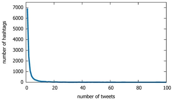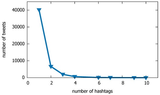 Figure 9 and Figure 10 show the distribution of the number of tweets for each hashtag and the distribution of the number of hashtags for each tweet, respectively, which follow a power-law distribution. From the two figures, the following can be learned: (1) more than 95% of the hashtags appeared in fewer than 20 tweets; and (2) about 10% of the tweets had more than one hashtag, while 98% of the tweets had less than five hashtags.