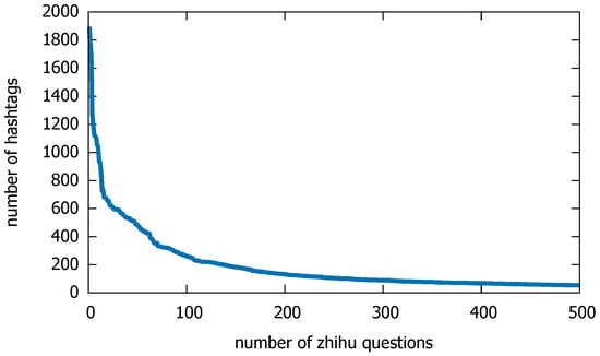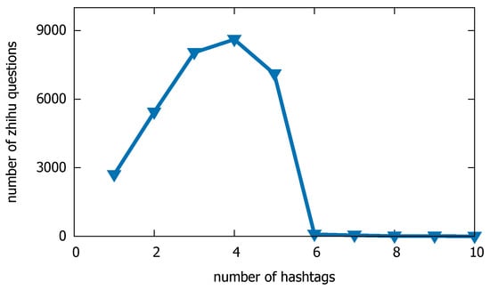 The second dataset was crawled from Zhihu, a Chinese question-and-answer website. We collected our dataset from the Zhihu topic square []. We randomly crawled 150,000 hot questions and their hashtags from 100 subtopics under the 33 main topics. Then, the hashtags that appeared less than three times were removed as well as questions that had more than five hashtags. Finally, 278 42,060 questions and their 3487 hahstags remained. We randomly se80% questions as the training data, while 10% were used as the validation and 10% for test data. We repeat this process for five times, and then take the average results on the test data as the final experimental results. The statistics of the dataset are shown in Table 2 and Figure 11 and Figure 12.