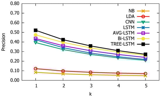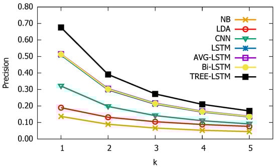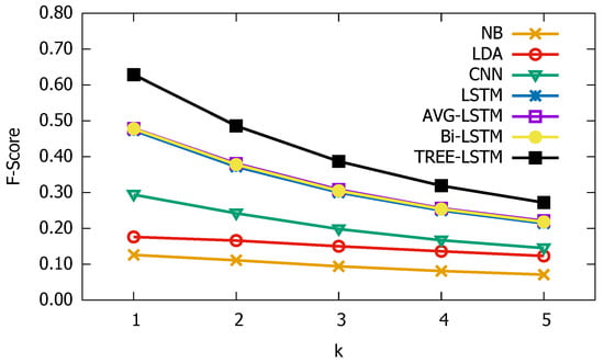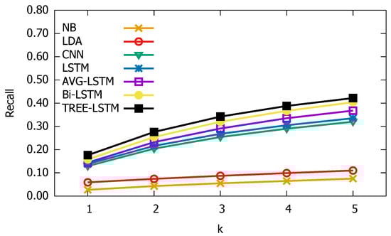 Similarly, we also evaluated the top-k recommendation results of different methods of Zhihu dataset in Figure 16, Figure 17 and Figure 18. It can be observed that Tree-LSTM still outperformed the other methods substantially in all cases. However, for all methods, the performance of the Zhihu dataset is worse than that of the twitter dataset. We suppose this is because the average number of hashtags in the Zhihu dataset is large.