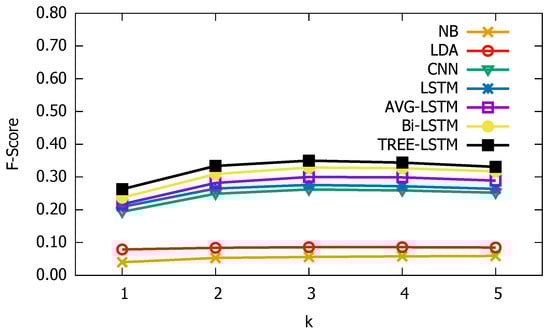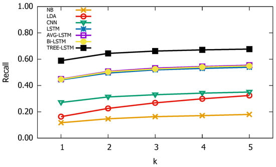 Many microblog posts have more than one hashtag; therefore, we also evaluated the top-k recommendation results of different methods. Figure 13, Figure 14 and Figure 15 show the precision, recall, and F1 curves of NB, LDA, CNN, LSTM, AVG-LSTM, Bi-LSTM and Tree-LSTM on the test data respectively. Each point of a curve represents the extraction of a different number of hashtags, ranging from 1 to 5. It can be observed that although the precision and F1-score of Tree-LSTM decreased when the number of hashtags was larger, Tree-LSTM still outperformed the other methods. Moreover, the relative improvement on extracting only one hashtag was higher than that on more than one hashtag, which shows that it is more difficult to recommend hashtags for a microblog post with more than one hashtag.