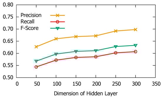 We further investigate the effect of hyperparameters to the performance in Twitter dataset. We vary the dimension of hidden layers in Tree-LSTM from 50 to 300, with a gap of 50. As shown in Figure 19, we find the performance improved when the dimension of hidden layer increased.