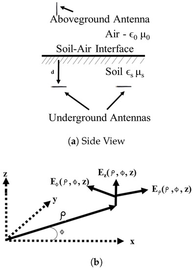 The drawing of the geometry of the underground antenna in the soil propagation medium: (a) schematic; (b) coordinate system.