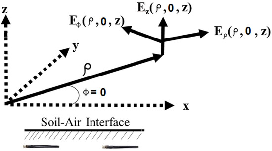 Consider the x-directed horizontal electric dipole [18] at the point on the downward-directed z-axis in the half-space (Region 1) defined by . Region 2 is defined by . The wave numbers of the two regions are , where and . It is assumed that both regions are nonmagnetic, so that . Based on Maxwell’s equations, the following results are reached: