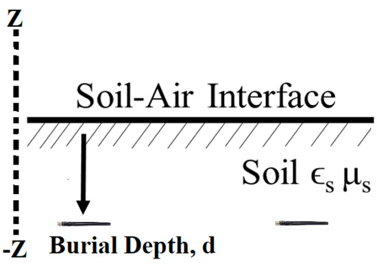 The first generation of wireless underground communication systems was developed in the 2000s and was based on the application of the Over-The-Air (OTA) Friis transmission formula to the underground wireless channel [6,15]. In the early 2010s, the second generation of wireless underground communications was developed based on the impulse response analysis and advanced multi-carrier techniques [10,37]. The major development in the second-generation wireless underground communications is the statistical model of the underground channel, which has been developed based on the extensive empirical campaign both in field and testbed environments [9,10]. The model can predict the Root Mean Square (RMS) delay spread, coherence bandwidth, and path loss. Because the statistical model has been developed based on the statistical and information theoretic perspective, it lacks the insight into the physics of subsurface radio wave propagation, which can only be provided by Maxwell–Poynting theory-based signal processing. However, there is no underground channel model available based on the subsurface electromagnetic-based signal processing analysis, and only the numerical evaluations and results have been presented. Accordingly, to gain the physical insight into the propagation of wireless underground communication waves and to ensure that the wireless underground communication system performance is optimal in different subsurface media, it is vital to have an underground propagation prediction model based on electromagnetic using physics principals applicable to radiation efficiency, antenna design, and power transfer at different distances and depths in the soil medium.