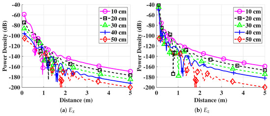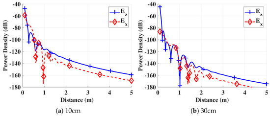 The comparison of the power density of and components at different burial depths is shown in Figure 4. It can be observed that at a 10-cm depth (Figure 4a), the power density of the horizontal component , which is the lateral wave component (,0,z), was on par with the component. However, for distances greater than 1 m, the horizontal component became 11 dB weaker as compared to the . This happened because of the higher attenuation of the component in the medium. This became clearer when the depth increased to 30 cm (Figure 4b). At a 30-cm depth, the lateral component had a strong power density at shorter distances (<1 m). With the increase in distance, the horizontal component decreased gradually. Similar results have also been obtained in [10], and those empirical results showing the dominance of the lateral wave confirm the accuracy of this underground propagation prediction model. Moreover, the model accurately captured the physical propagation differences due to the propagation of different components.