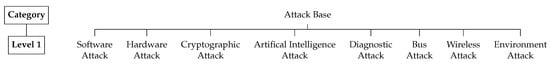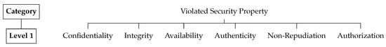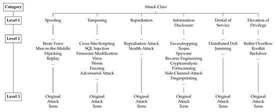 This category describes the classification of an attack into a threat class. A problem with that classification are the different terms used in publications. For example, synonyms such as “sniffing”, “monitoring”, “listening”, “eavesdropping”, or “capturing” are used to describe the process of reading information from a component or communication system. The challenge in classifying a threat class is finding classes which provide a sufficiently generalized description, but show enough detail to comprehend the nature of an attack. For that reason, we have made a hierarchical classification into three classes as shown in Figure 6. Level 1 represents the spoofing, tampering, repudiation, information disclosure, denial of service, elevation of privilege (STRIDE) classification of Microsoft [63]. This model is used by Microsoft to identify threats as part of threat modeling. Since the STRIDE terminology is established in the security community, we use it to define our attack class. On level 2, we propose a classification into typical attack types takes place to specify a threat. On level 3, the concrete term of an attack is listed as a reference to the attack publication.