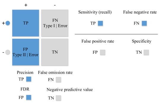 - Lever, J.; Krzywinski, M.; Altman, N. Points of significance: Classification evaluation. Nat. Methods 2016, 13, 603–604. [Google Scholar] [CrossRef]