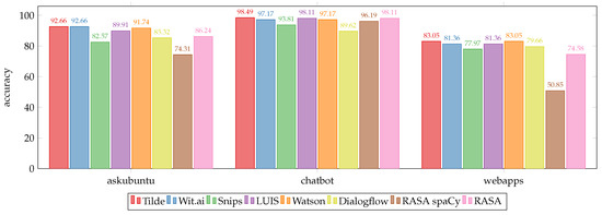 We also compare our results with the results of several other popular dialogue system providers. In [39], the quality of intent detection and entity recognition was compared for several dialogue system providers—namely, Google Dialogflow (formerly called API.ai) (https://dialogflow.com/), Microsoft LUIS (https://www.luis.ai/), IBM Watson (https://www.ibm.com/watson/), and RASA (https://rasa.com/). Furthermore, the Snips team added Snips.ai (https://snips.ai/) and RASA with the spaCy backend to the comparison [40]. Wit.ai (https://wit.ai) was not tested in [39] because of the unreliability of their import system. However, we managed to test Wit.ai, and added it to the comparison.