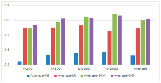 In order to highlight the advantages of the CNN model, we use the traditional machine learning models for comparison. Figure 4 shows the average of the experimental results for different values of k combined with different models. Let k = 500, the comparison results are shown in Table 7.