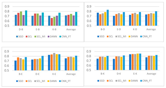 According to Figure 5, the CNN_FT method achieves better results in cross-domain sentiment analysis. Clearly, the proposed CNN_FT performs better than other methods including the state-of-the-art method SCL in most tasks except “K-E” data sets. The result of transferring from the Book domain to the DVD domain is significantly improved by 5%. The result of transferring from the Electronic domain to the Kitchen domain can reach 85.35%.